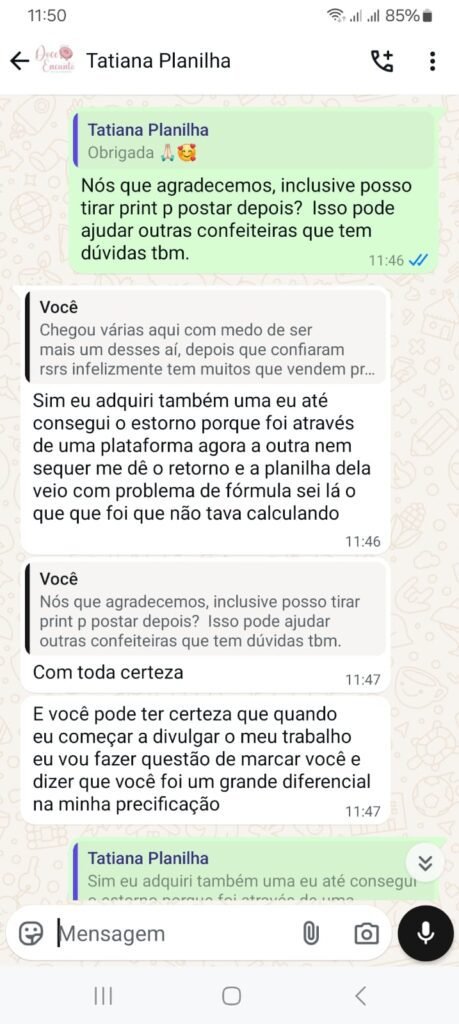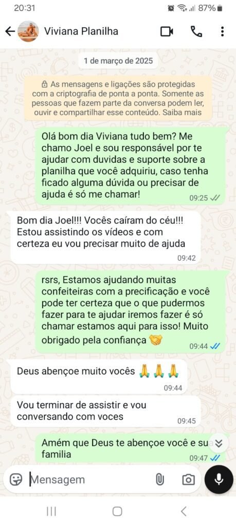 Nossa planilha foi desenvolvida para se adaptar perfeitamente a você que Precisa precificar suas receitas com maior precisão. Com ela, você poderá inserir todos os seus custos e margens desejadas, obtendo um preço final calculado de forma automática. Se ainda tiver dúvidas, Basta chamar nosso suporte que prestamos todo auxilio necessário exclusivo para tirasr suas dúvidas diretamente no WhatsApp!