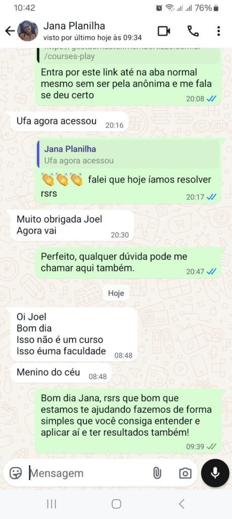 E o melhor: você conta com suporte individual no WhatsApp sempre que precisar, pra tirar dúvidas e garantir que vai usar tudo do jeito certo.