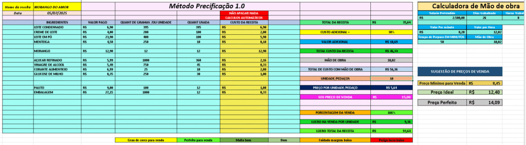 Basta informar o preço dos ingredientes e as quantidades usadas na receita, a planilha faz o resto automaticamente:
